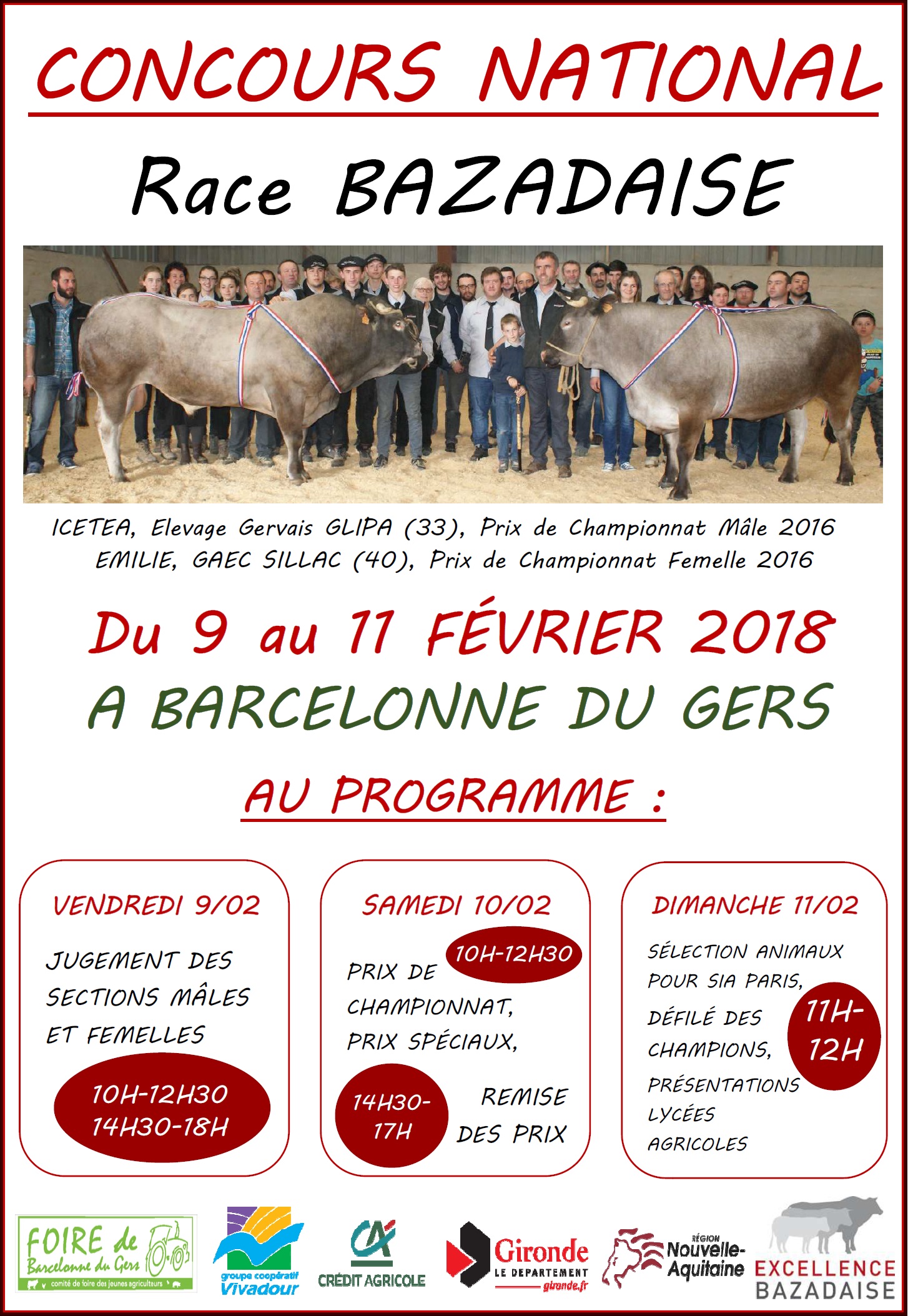 Programme du Concours National Bazadais présent pour la 45ème foire au Matériel Agricole d’Occasion de Barcelonne du Gers sur le parc de Vivadour